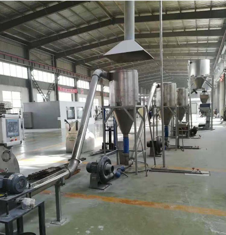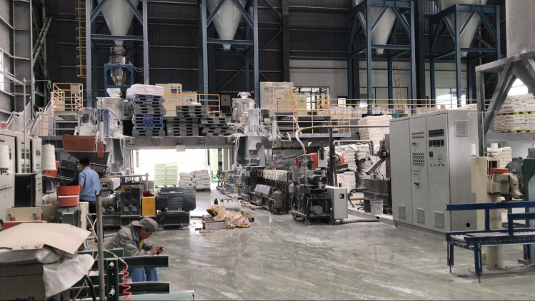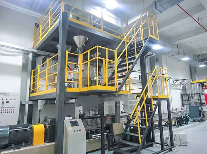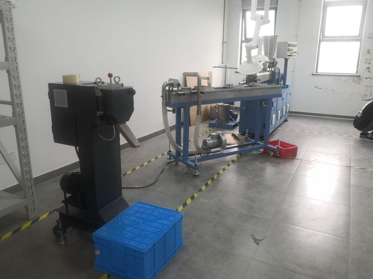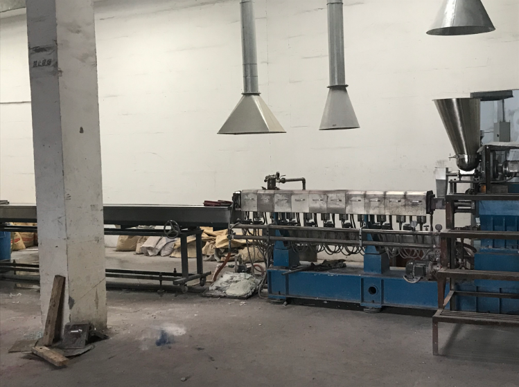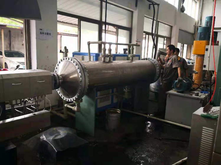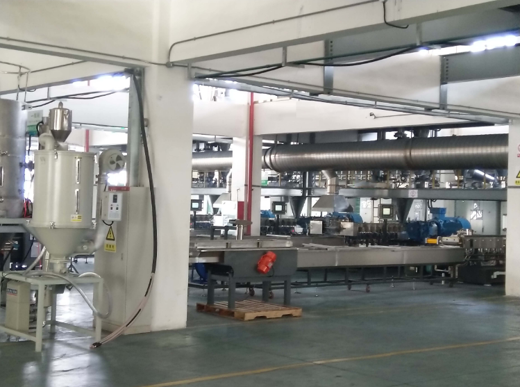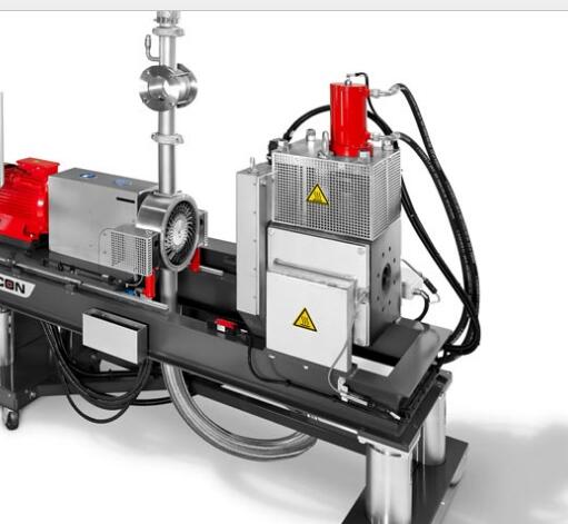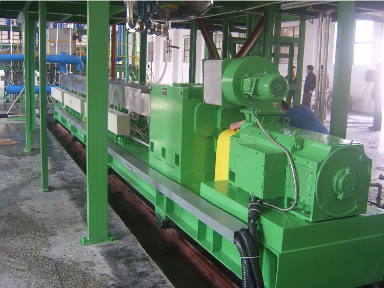 上階機為JWP系列平行同向雙螺桿混煉機。利用雙螺桿的高速、高剪切、強混合優勢,使物料充分完成塑化混合,由于無機頭背壓,使得我們針對不同物料靈活的排列螺桿組合,達到物料混合較好狀態。